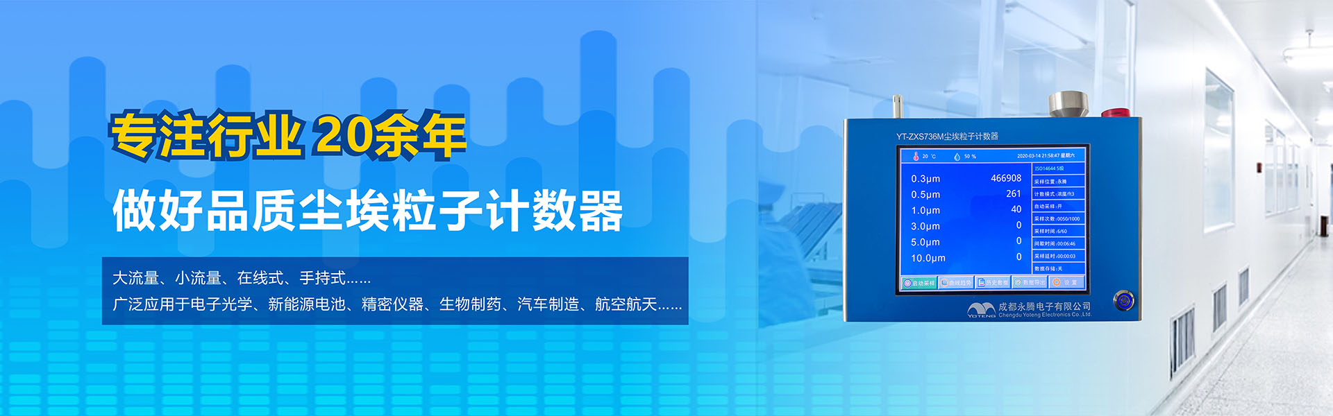 成都永騰電子有限公司位于成都市國家經(jīng)濟(jì)技術(shù)開發(fā)區(qū),是一家專業(yè)從事環(huán)境空氣監(jiān)測儀器研發(fā)、生產(chǎn)、銷售于一體的高科技企業(yè)。產(chǎn)品涵蓋空氣檢測儀器、潔凈間在線塵埃粒子計(jì)數(shù)器監(jiān)測系統(tǒng)、大氣顆粒物監(jiān)測微站系統(tǒng)、電化學(xué)分析儀器、實(shí)驗(yàn)室設(shè)備等產(chǎn)品。